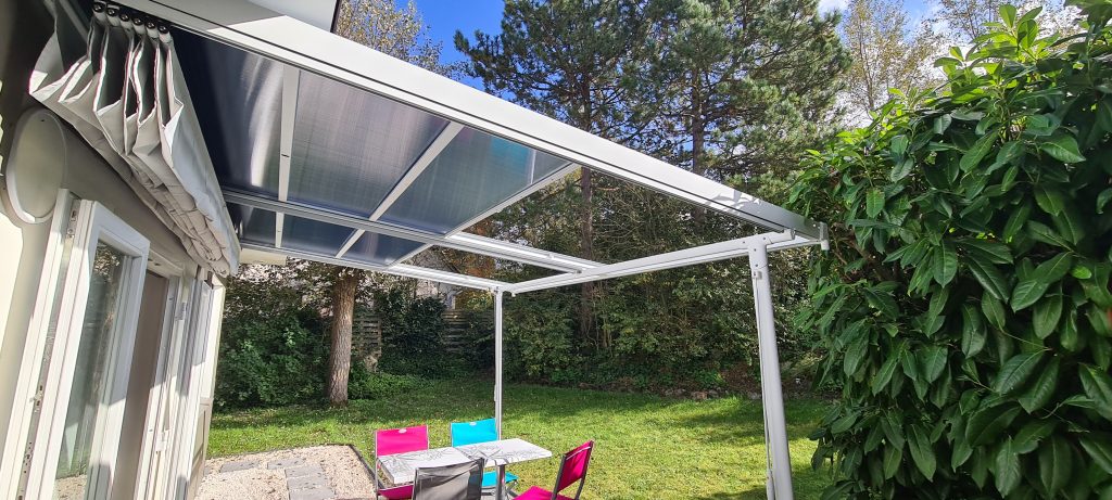 - Ensoleillé : un panneau de la pergola coulisse et découvre une moitié de la terrasse ;